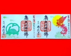 今月の御朱印は、中秋の名月を背景に南の朱雀が舞上がり、秋の夜長に北の玄武が雲に鎮座して、佛様をお護りします。朱に輝く「西方極楽浄土」の印で、先月に続き、最強の「強運」御朱印をお授けいたします。