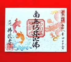 今年も端午の節句御朱印は、「登竜門」の御朱印をお授けいたします。御朱印の左下から鯉が流れに逆らって飛び上がり、佛様のご加護をいただき、天高く龍に変化します。雨雲や雷を支配するといわれる龍は、佛様の慈光のもと、恵の雨を降らせます。私達も滝を登る鯉のように精進し、佛様の御力をいただいて、世の中に貢献する龍にしていただきましょう。勇気と希望と強運をいただける御朱印です。